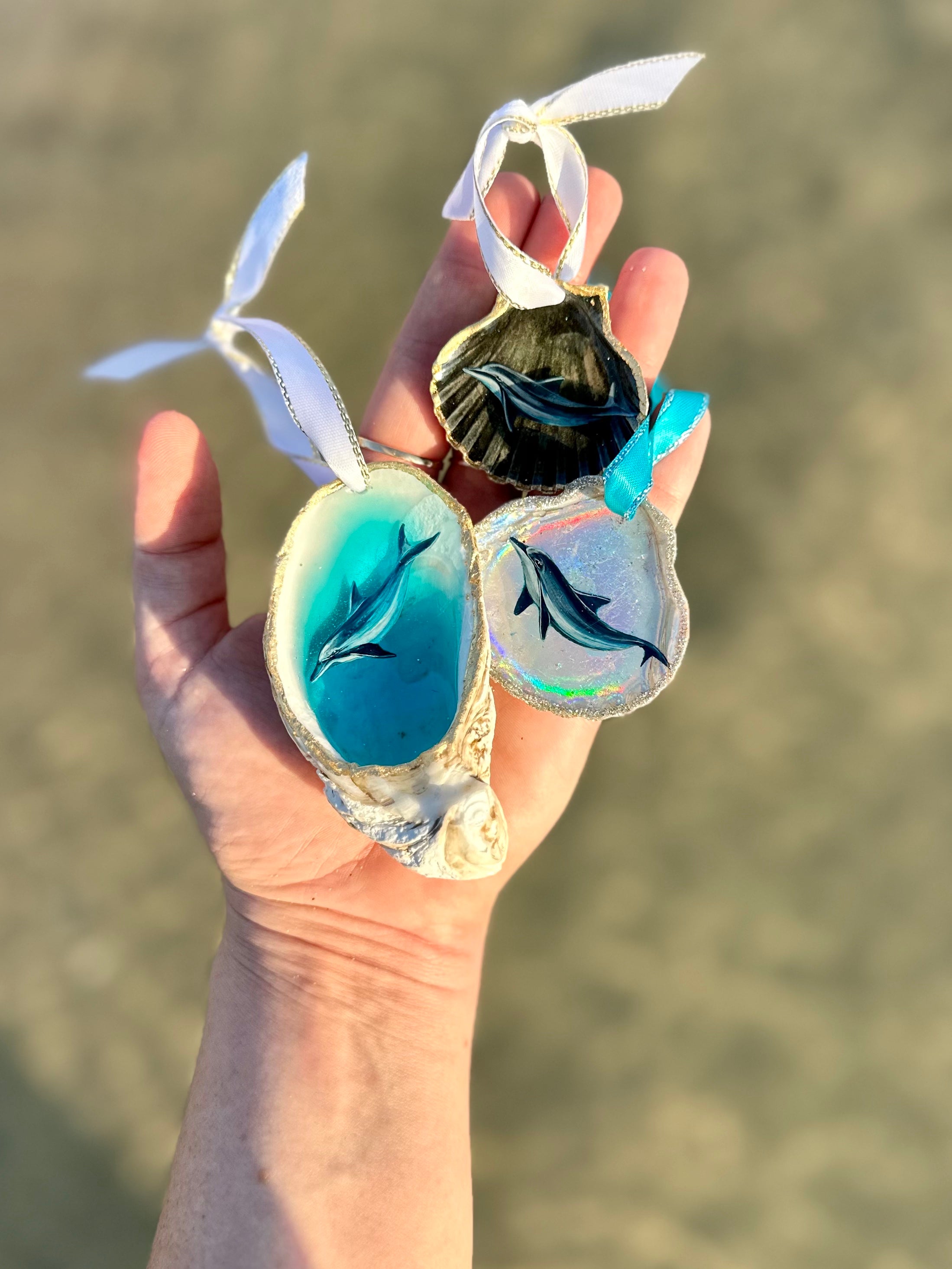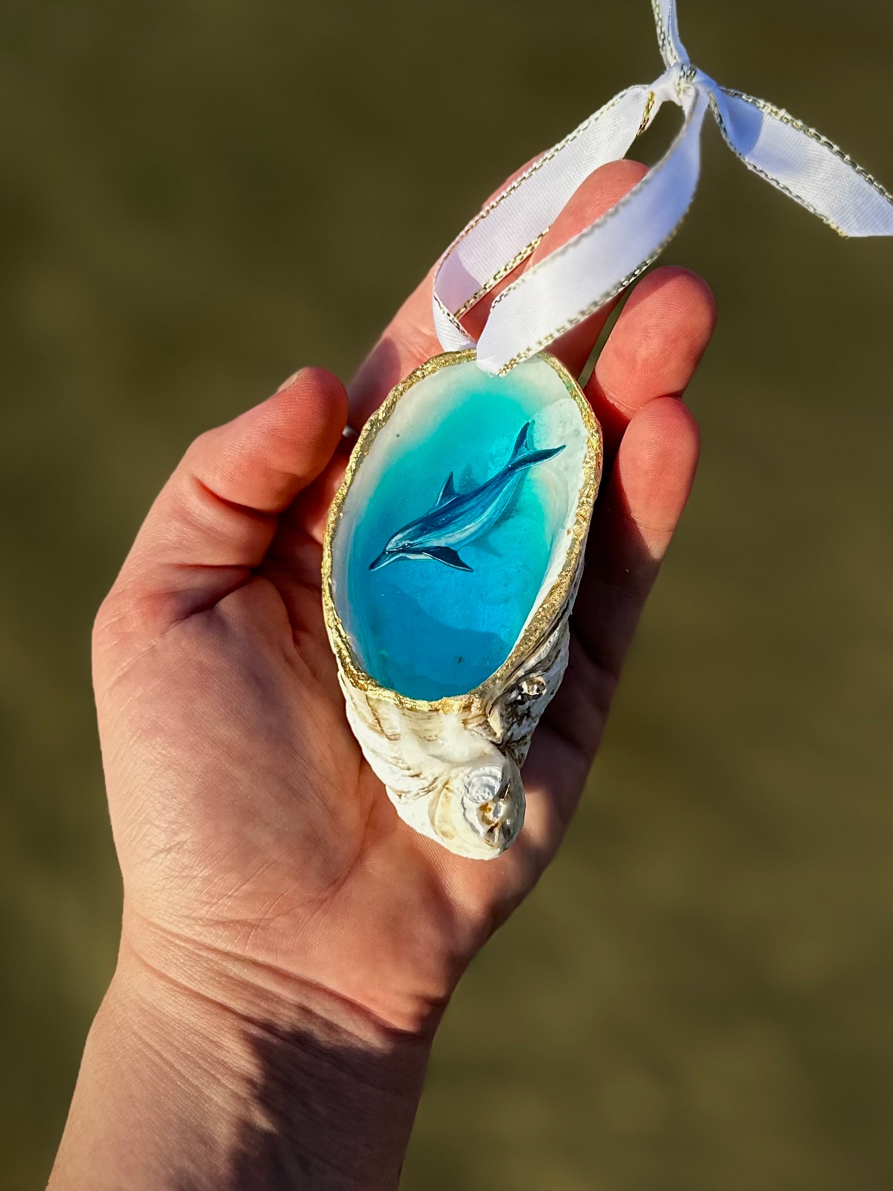 Double layer resin pour, hand painted, enhanced with precious metals or mica powder cocoon, satin ribbon. Inside an oyster seashell <3