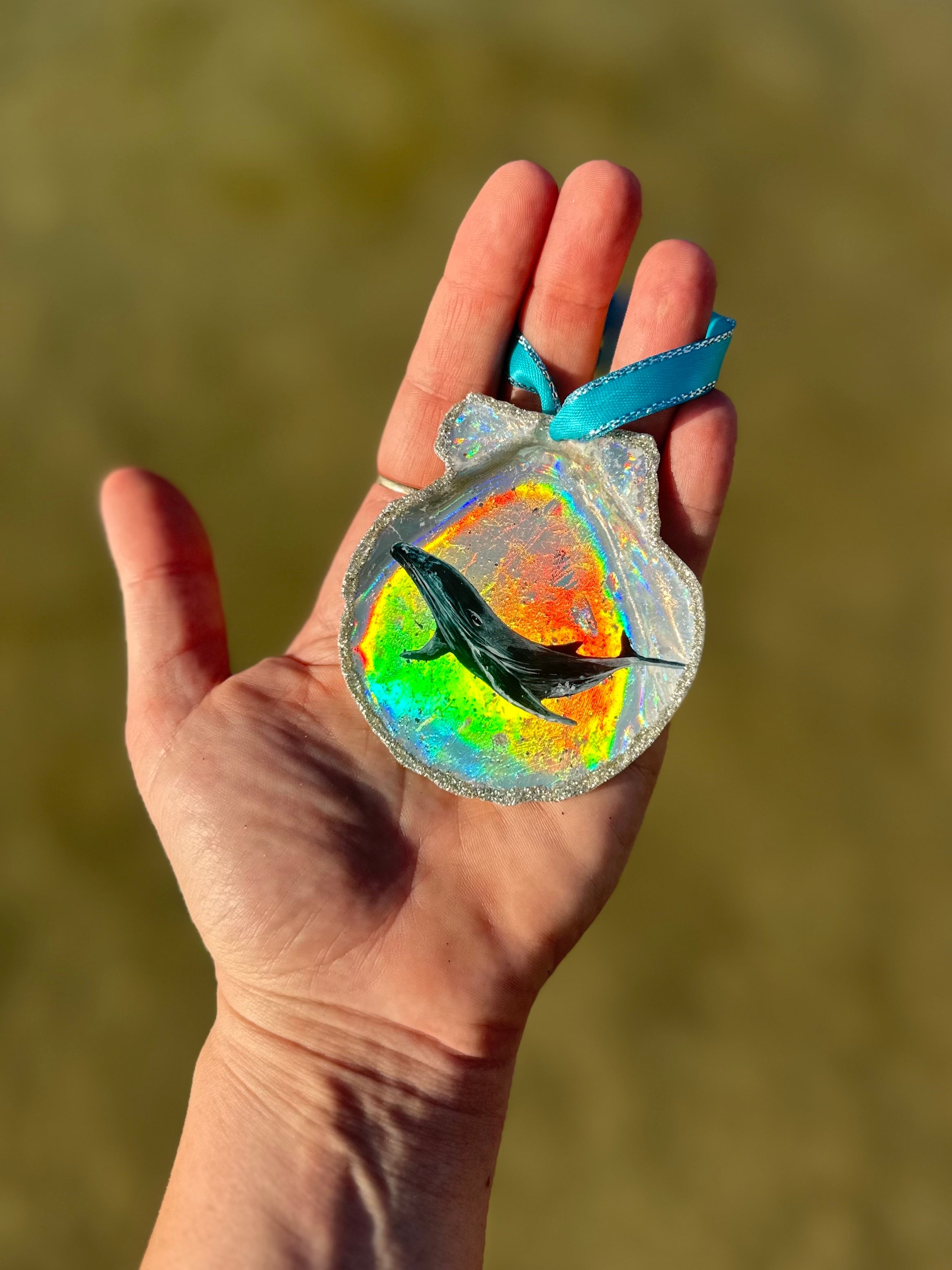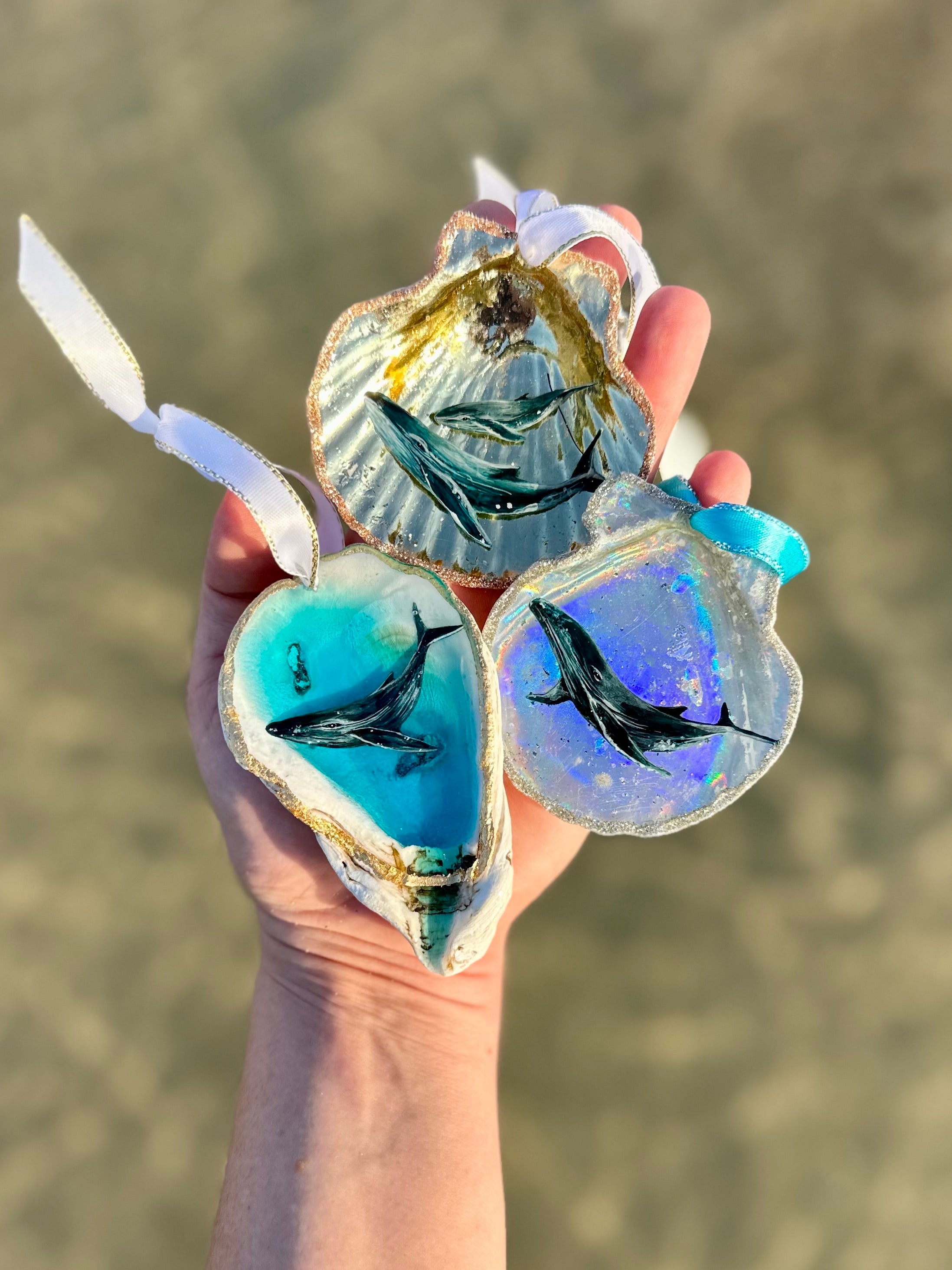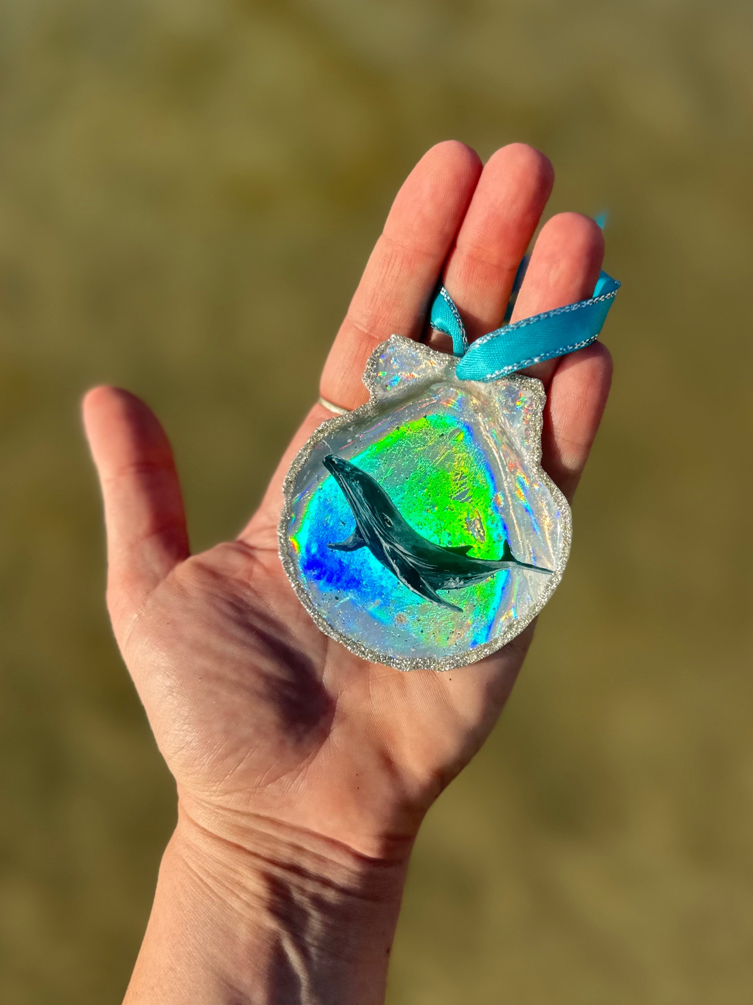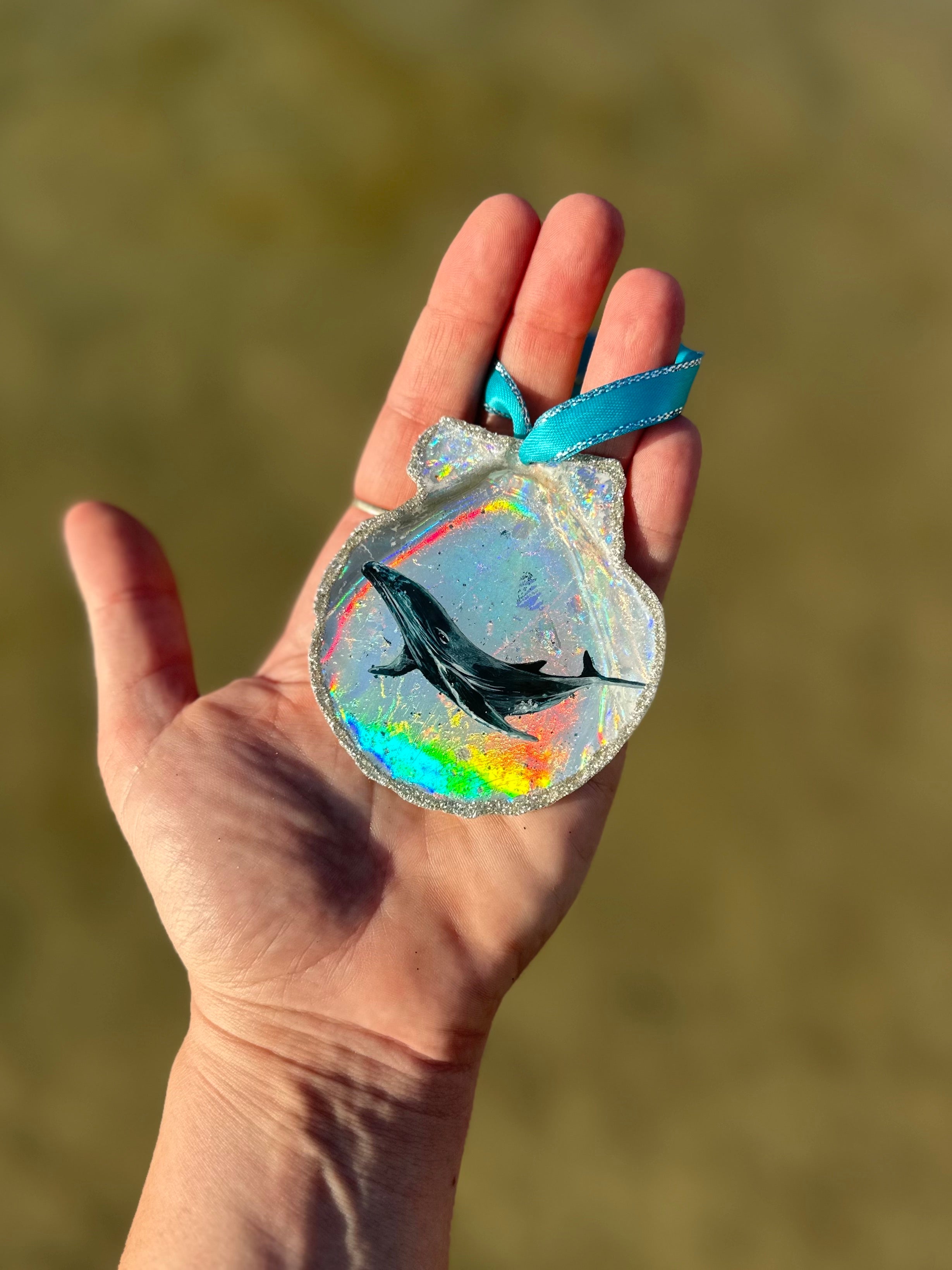 Double layer resin pour, hand painted, enhanced with precious metals or mica powder cocoon, satin ribbon. Inside a scallop seashell <3