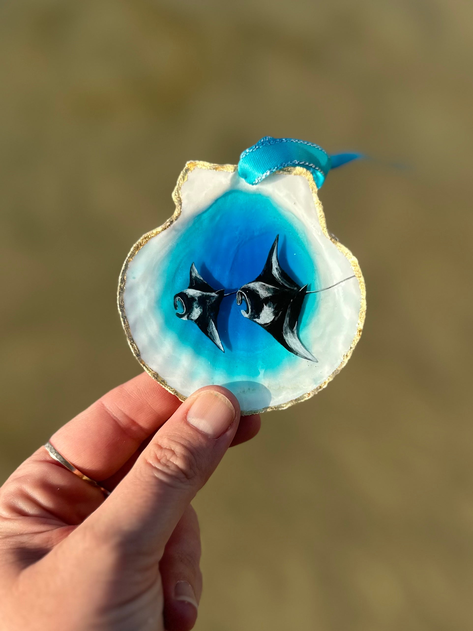 Double layer resin pour, hand painted, enhanced with precious metals or mica powder cocoon, satin ribbon. Inside a scallop seashell <3