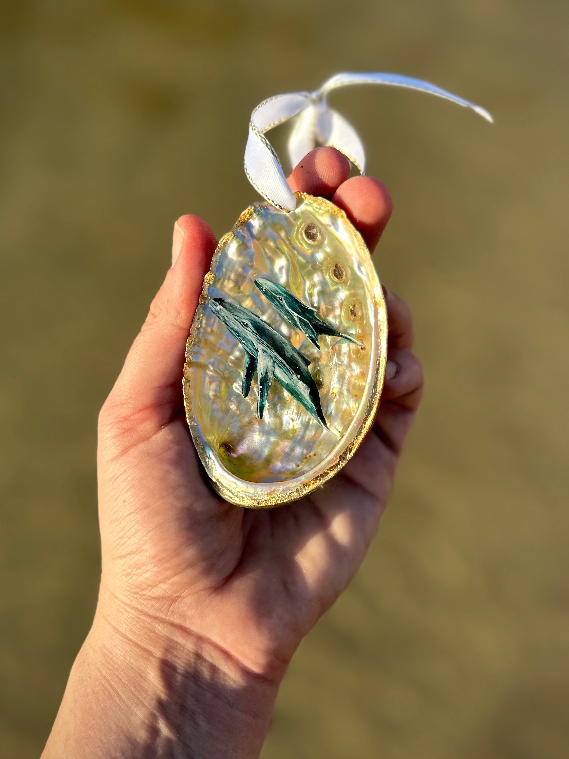 Double layer resin pour, hand painted, enhanced with precious metals or mica powder cocoon, satin ribbon. Inside an abalone seashell <3