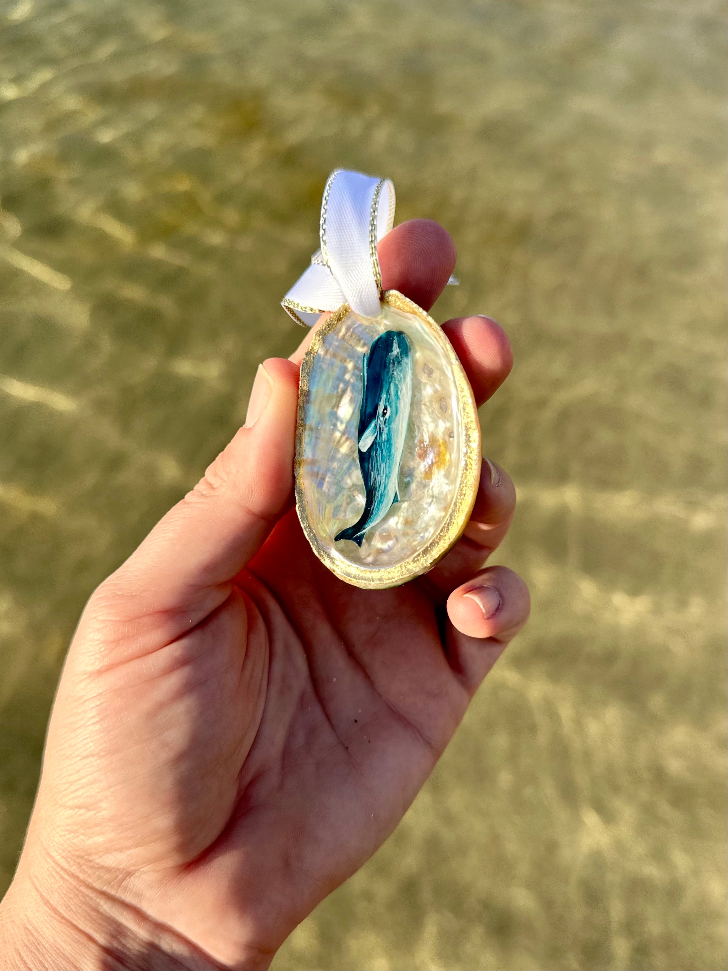 Double layer resin pour, hand painted, enhanced with precious metals or mica powder cocoon, satin ribbon. Inside an abalone seashell <3
