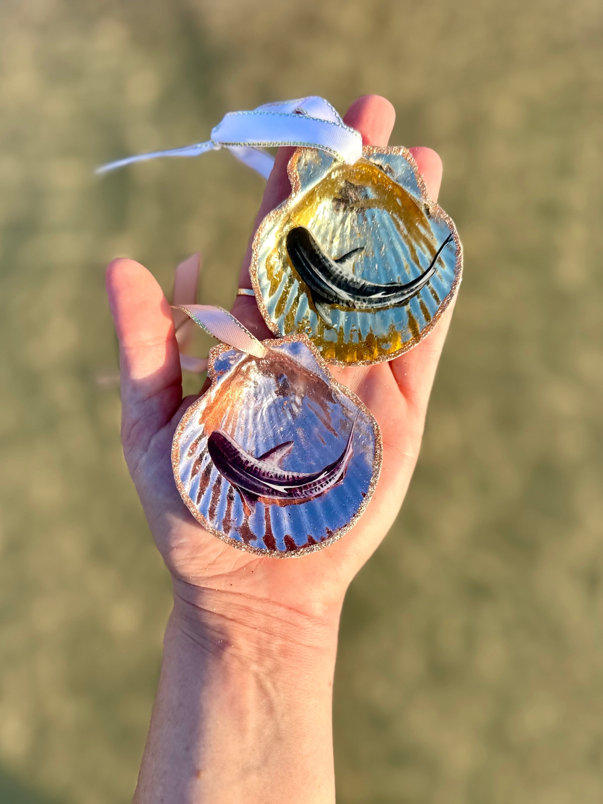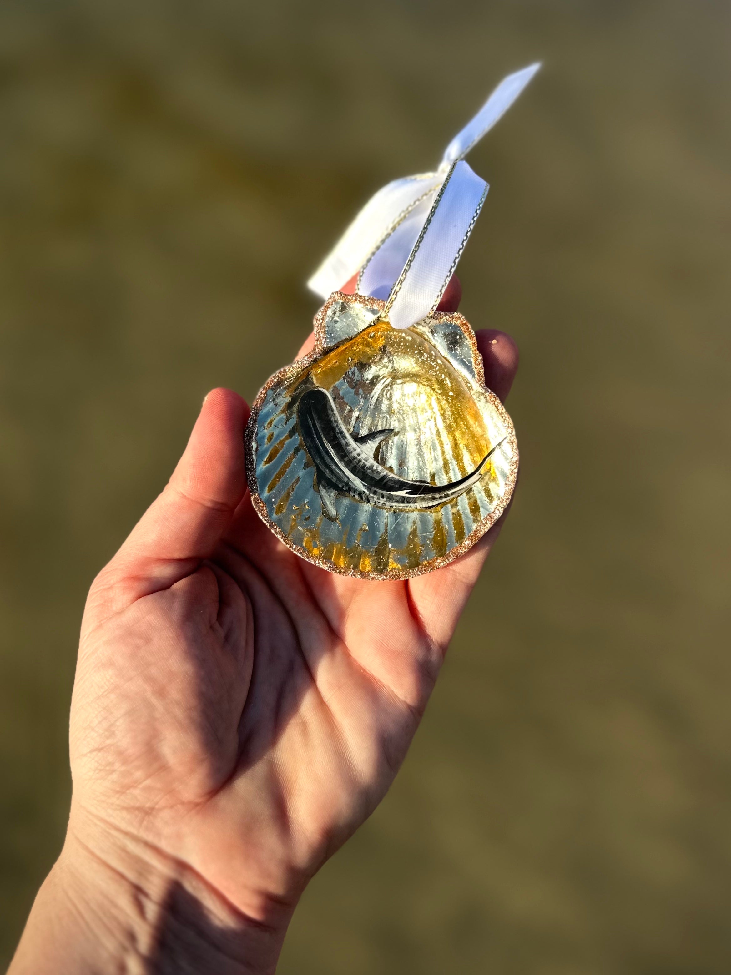 Double layer resin pour, hand painted, enhanced with precious metals or mica powder cocoon, satin ribbon. Inside a scallop seashell <3